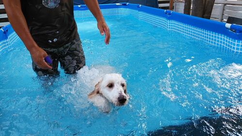 ドックランの中に、プールがあって、そこで、1頭500円で スタッフが付き添って泳がせてくれます 最初、ジタバタして泳げなかったのですが、ミデイくん、コツをつかんだようで、泳ぎはじめました。 暑い夏にはもってこいのレジャーですね ブレンデイくんは、まだ、修…